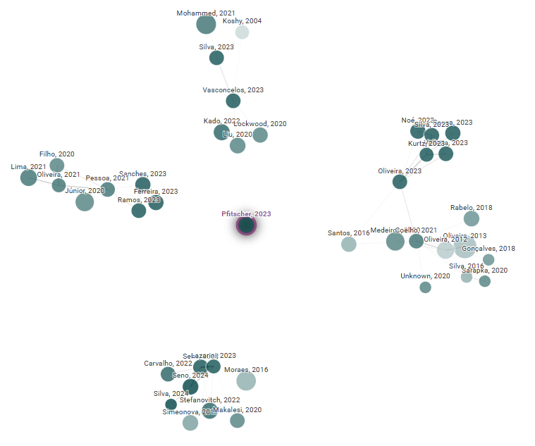 - Cluster Direito: Este grupo (com Noé 2023, Oliveira 2023, Medeiros 2021) parece ser a área de maior aderência ou o estado da arte mais direto. Há muitas conexões internas, o que sugere um campo de pesquisa muito ativo e interconectado.