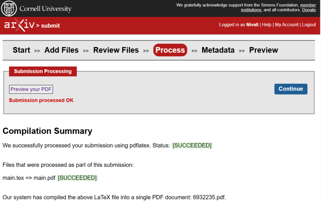 - Clique em “Upload”. O arXiv irá descompactar e processar os arquivos.