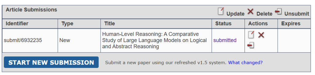 Você receberá um e-mail de confirmação. Seu artigo terá o status “Processing” (Processando) e será designado um número de pré-publicação na próxima janela de processamento do arXiv (geralmente no dia útil seguinte). No meu artigo (com submissão mostrada na imagem abaixo) está aparecendo com o status “Submitted” (Submetido) no arXiv. Isso significa que completou o processo de submissão com sucesso e está agora na fila de processamento do arXiv.